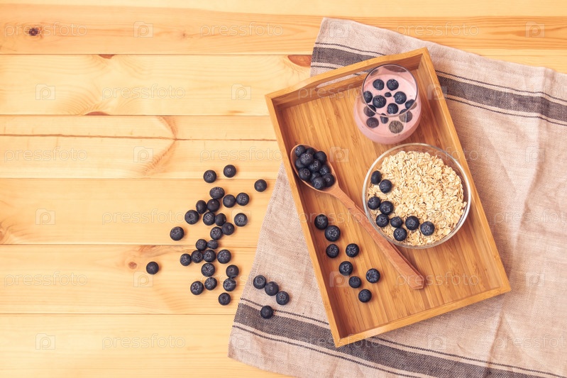 Овсяные хлопья с черникой в миске и черничным йогуртом на деревянном столе. Концепция здорового питания