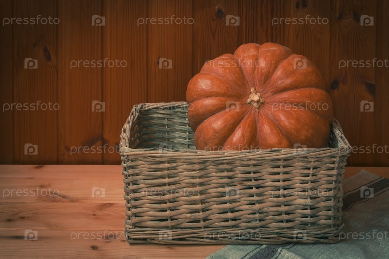 Одна тыква в плетеной корзине на деревянном столе