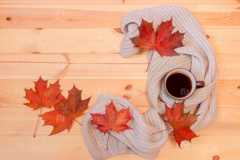 Кружка горячего кофе, завернутая в шарф и разноцветные осенние кленовые листья на деревянном фоне
