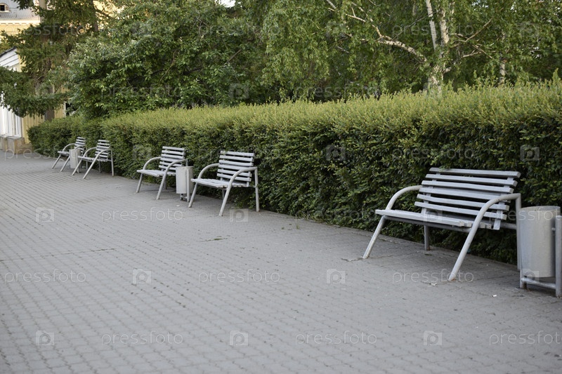 Скамейки и урны в парке отдыха. Места для отдыха в городе