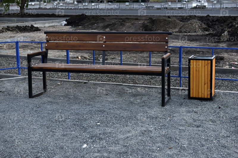 Скамейки и урны в парке отдыха. Места для отдыха в городе