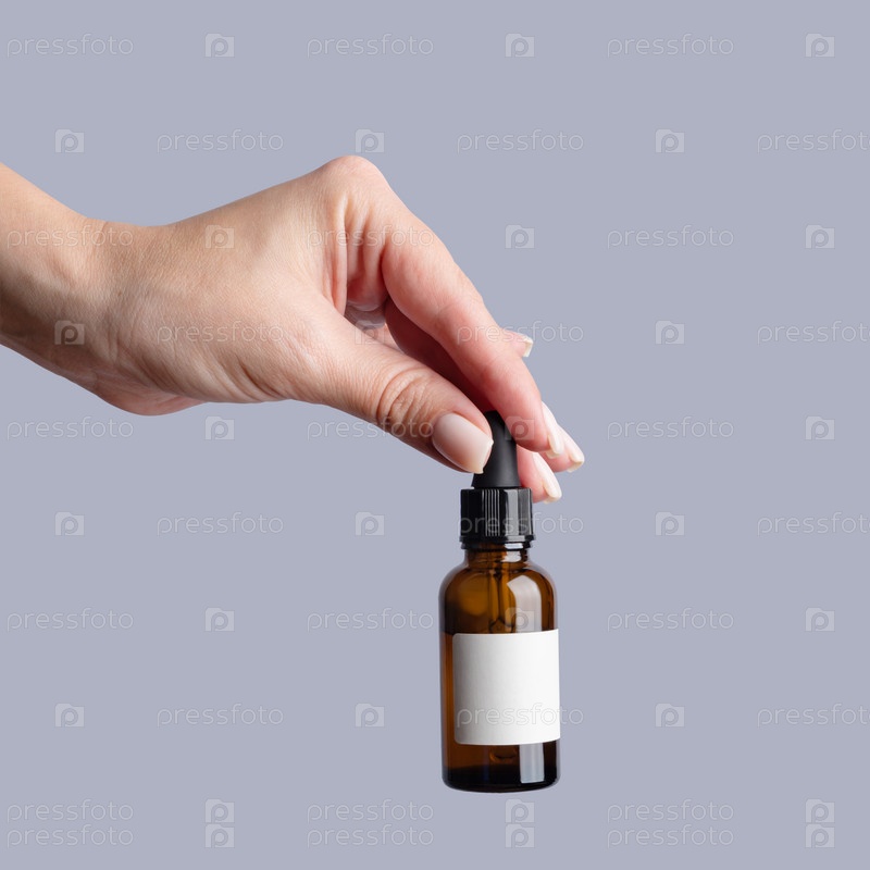 Рука, продукт и сыворотка с женщиной в студии на сером фоне для продвижения антивозрастного лечения. Уход за кожей, красота и бутылка с женской моделью. Макет