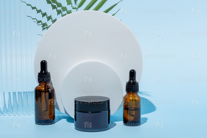 Белый круглый подиум с макетом косметики. Промо-подиум с эфирными маслами и кремами, композиция платформы для продвижения роскошной косметики на синем фоне с пальмовыми листьями