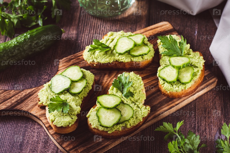 Кростини с пюре из авокадо, огурцами и зеленью на деревянной доске