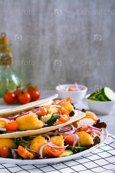 Тортилья с куриными наггетсами, овощами, луком и салатом на тарелке по вертикали