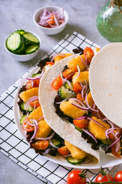 Тако с куриными наггетсами, огурцом, помидором, луком и салатом на тарелке по вертикали