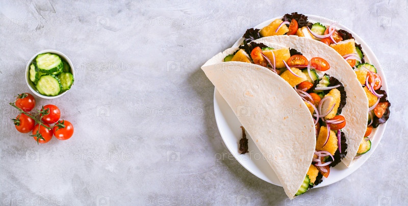 Тако с куриными наггетсами, огурцом, помидорами, луком и салатом на веб-баннере с видом сверху на тарелку