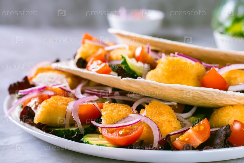 Крупный план тако с куриными наггетсами, огурцом, помидором, луком и салатом на тарелке