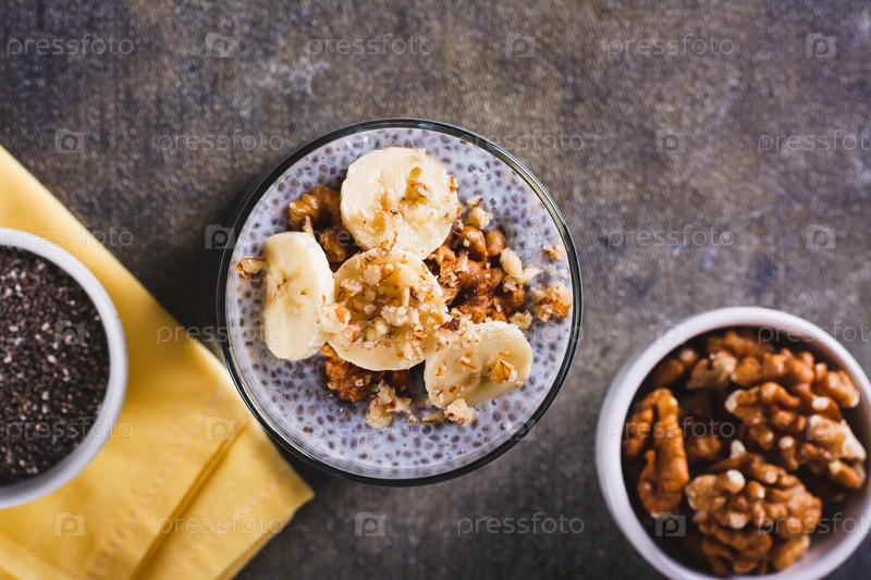 Крупный план вкусного завтрака из семян чиа с бананом и грецкими орехами в стакане на столешнице