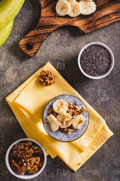 Пудинг из семян чиа со свежим бананом и грецкими орехами в стакане на столешнице и вертикальный вид