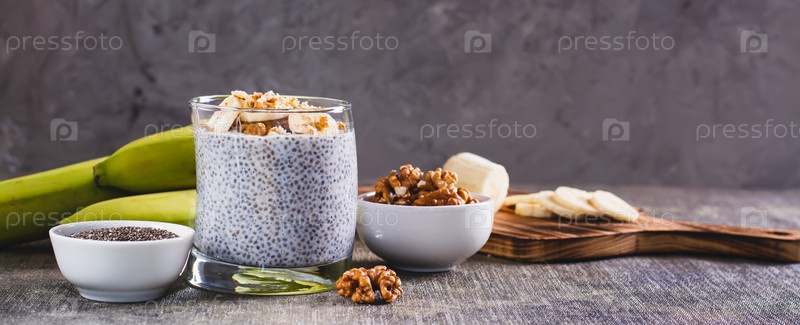 Вкусный завтрак семена чиа с бананом и грецкими орехами в стакане на веб-баннере стола