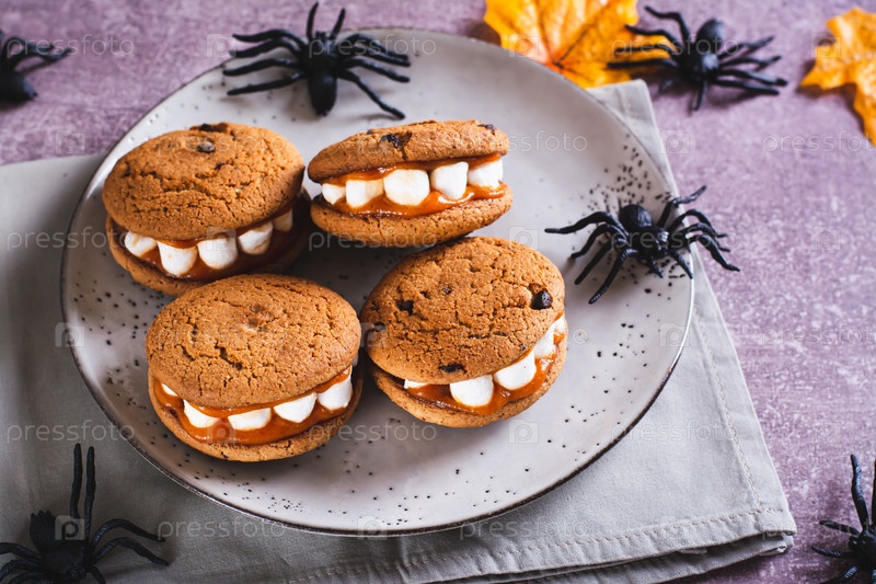 Хэллоуин угощает печеньем с зефирными зубами на тарелке и пауками
