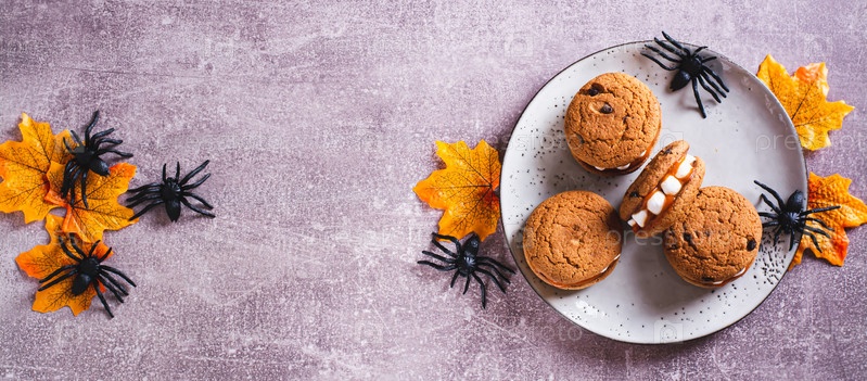Хэллоуин угощает печеньем с зубами зефира на тарелке и пауками, вид сверху, веб-баннер