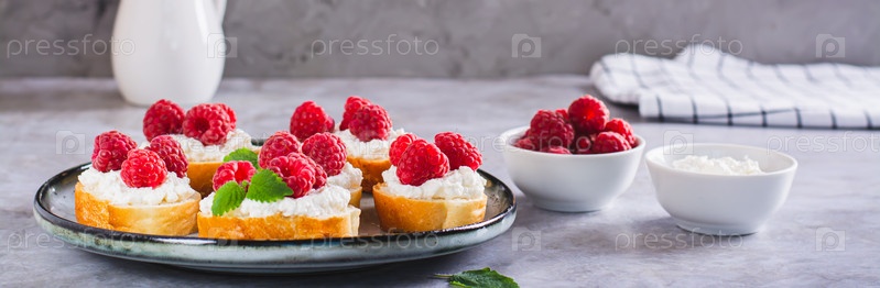 Свежие кростини с рикоттой, малиной и мятой на тарелке на веб-баннере стола