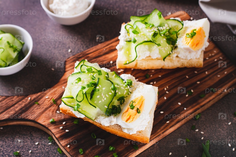 Брускетта с рикоттой, огурцом, вареным яйцом и кунжутом на доске