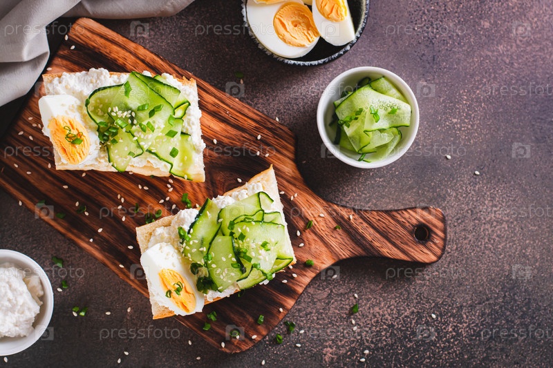 Бутерброды с рикоттой, ломтиками огурца, вареным яйцом и семенами кунжута на доске, вид сверху