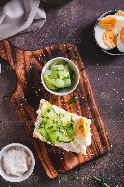 Брускетта с рикоттой, огурцом, вареным яйцом и семенами кунжута на доске сверху и вертикальном виде