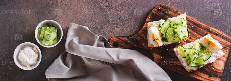 Брускетта с рикоттой, огурцом, вареным яйцом и семенами кунжута на доске, вид сверху, веб-баннер
