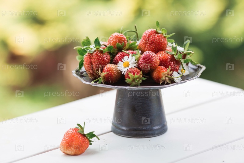 Фрукты и ягоды. Летнее время. Вкусная свежая клубника на стильном ретро железном подносе на белом столе. Место для текста