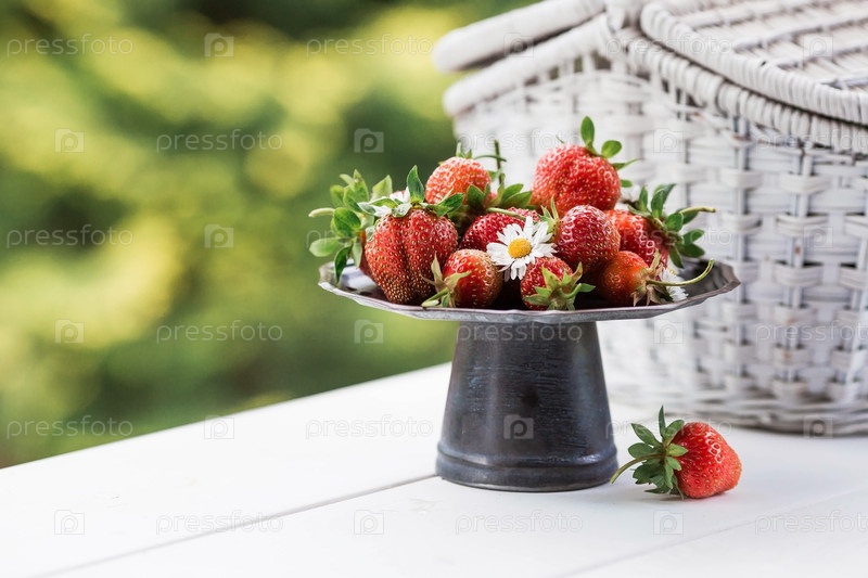 Фрукты и ягоды. Летнее время. Вкусная свежая клубника на стильном ретро железном подносе на белом столе. Место для текста