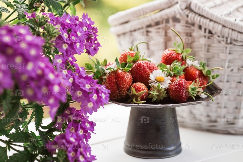 Фрукты и ягоды. Летнее время. Вкусная свежая клубника на стильном ретро железном подносе на белом столе. Место для текста