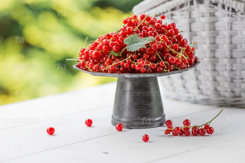 Фрукты и ягоды. Летнее время. Вкусная красная смородина на стильном железном подносе в стиле ретро на белом столе. Место для текста