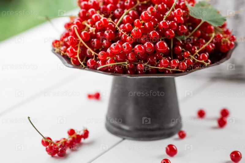 Фрукты и ягоды. Летнее время. Вкусная красная смородина на стильном железном подносе в стиле ретро на белом столе. Место для текста