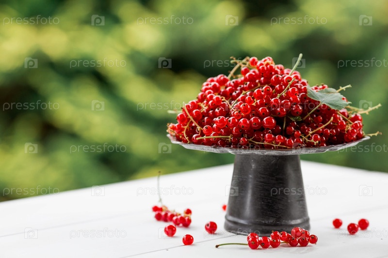 Фрукты и ягоды. Летнее время. Вкусная красная смородина на стильном железном подносе в стиле ретро на белом столе. Место для текста