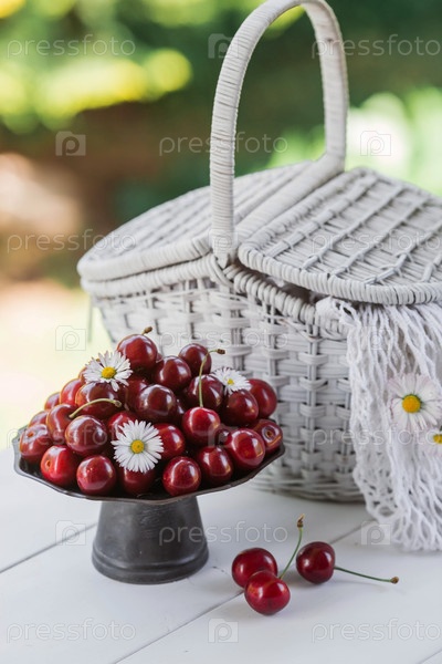 Фрукты и ягоды. Летнее время. Вкусные свежие вишни на стильном железном подносе в стиле ретро на белом столе. Место для текста