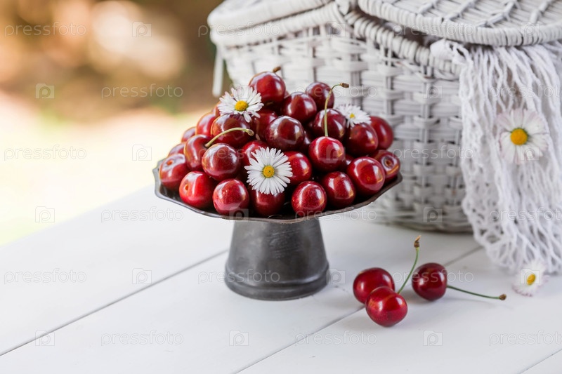 Фрукты и ягоды. Летнее время. Вкусные свежие вишни на стильном железном подносе в стиле ретро на белом столе. Место для текста