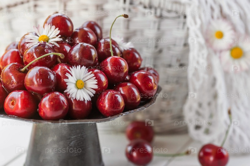 Фрукты и ягоды. Летнее время. Вкусные свежие вишни на стильном железном подносе в стиле ретро на белом столе. Место для текста
