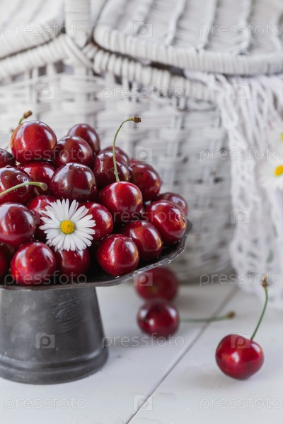 Фрукты и ягоды. Летнее время. Вкусные свежие вишни на стильном железном подносе в стиле ретро на белом столе. Место для текста