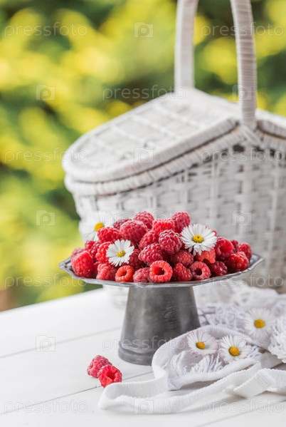 Фрукты и ягоды. Летнее время. Вкусная свежая малина на стильном железном подносе в стиле ретро на белом столе. Место для текста