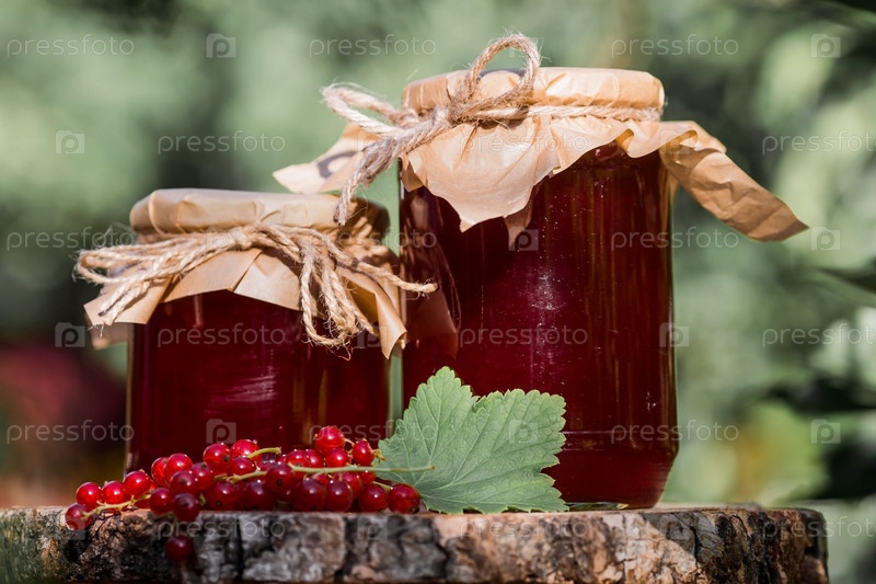 Домашнее полезное желе, варенье из красной смородины на фоне куста смородины. Подготовка банок. Сладости. Консервация и летний урожай