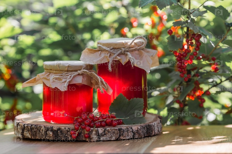 Домашнее полезное желе, варенье из красной смородины на фоне куста смородины. Подготовка банок. Сладости. Консервация и летний урожай