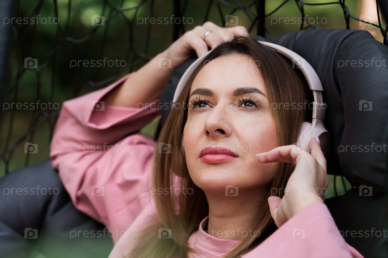 Молодая красивая женщина слушает музыку в наушниках с закрытыми глазами на висячем шезлонге в саду. Мир, гармония, расслабление и релаксация