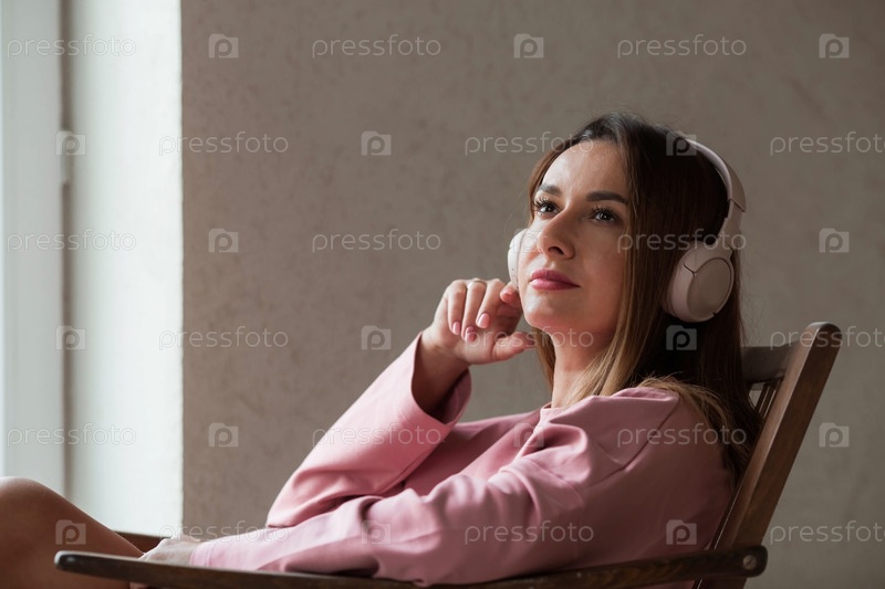 Молодая красивая женщина слушает музыку в наушниках с закрытыми глазами, сидя на ретро деревянном стуле... Мир, гармония, расслабление и расслабление