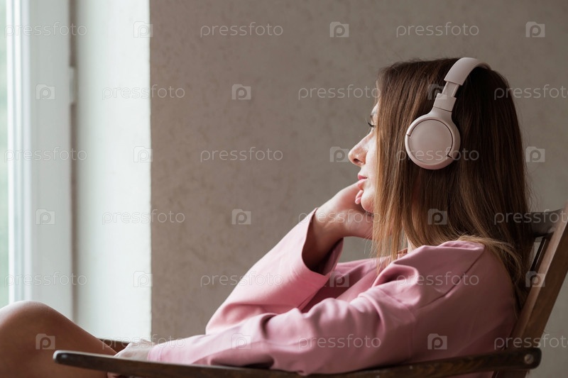Молодая красивая женщина слушает музыку в наушниках с закрытыми глазами, сидя на ретро деревянном стуле... Мир, гармония, расслабление и расслабление