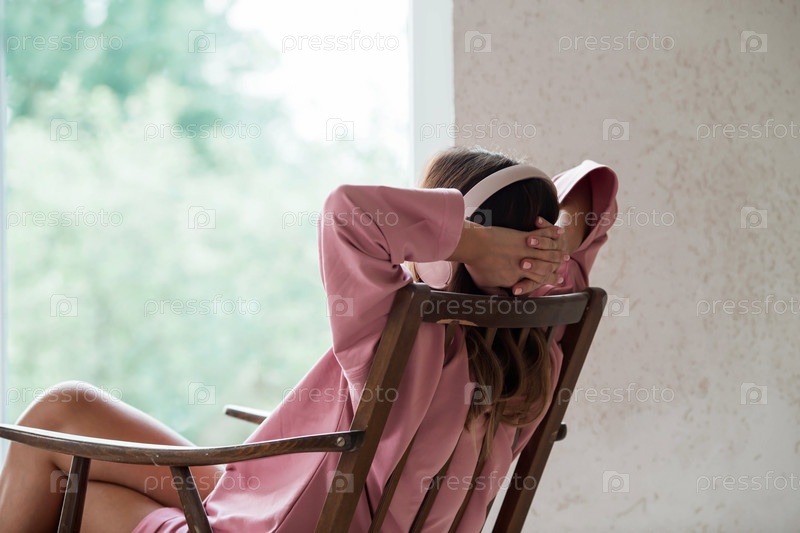 Молодая красивая женщина слушает музыку в наушниках с закрытыми глазами, сидя на ретро деревянном стуле... Мир, гармония, расслабление и расслабление