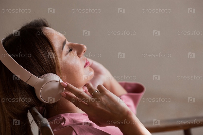 Молодая красивая женщина слушает музыку в наушниках с закрытыми глазами, сидя на ретро деревянном стуле... Мир, гармония, расслабление и расслабление
