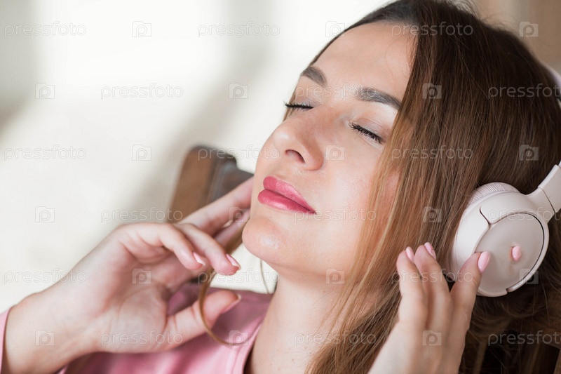Молодая красивая женщина слушает музыку в наушниках с закрытыми глазами, сидя на ретро деревянном стуле... Мир, гармония, расслабление и расслабление