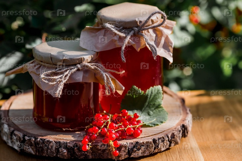 Домашнее полезное желе, варенье из красной смородины на фоне куста смородины. Подготовка банок. Сладости. Консервация и летний урожай