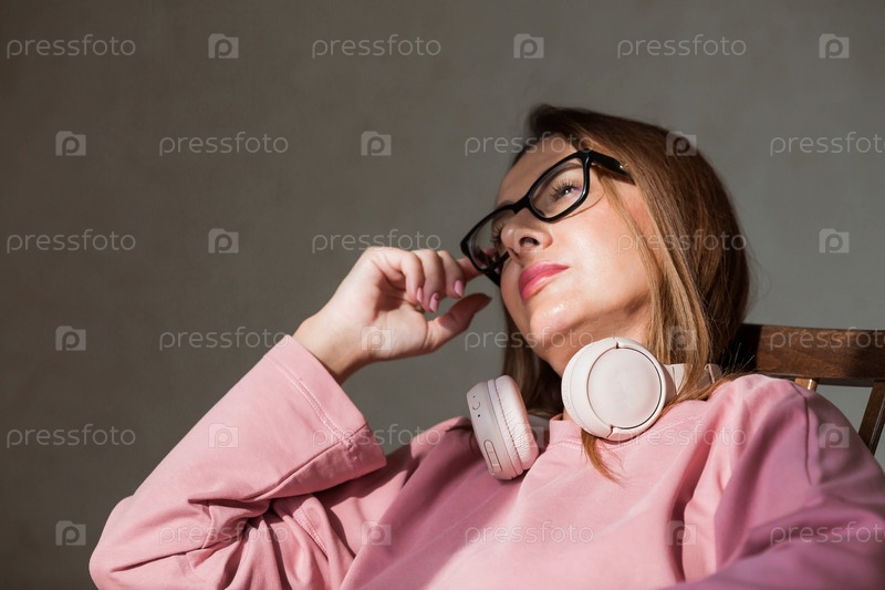 Молодая красивая женщина слушает музыку в наушниках с закрытыми глазами, сидя на ретро деревянном стуле... Мир, гармония, расслабление и расслабление