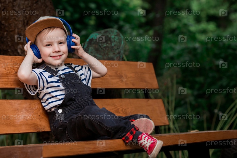 Милый, веселый, маленький мальчик улыбается и слушает музыку в больших синих наушниках на природе в парке. Музыка для развития детей