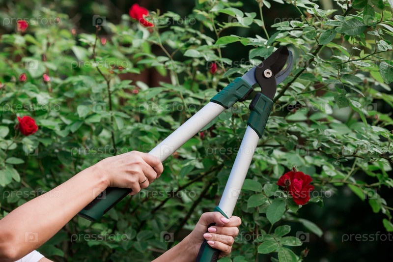 Садовник отрезает специальными секаторами плодовые деревья в саду. Уход за растениями, обрезка деревьев