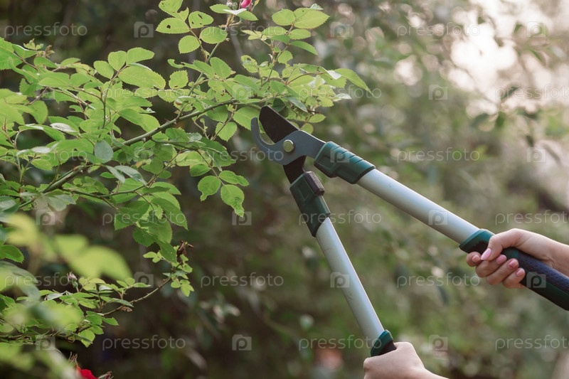 Садовник отрезает специальными секаторами плодовые деревья в саду. Уход за растениями, обрезка деревьев