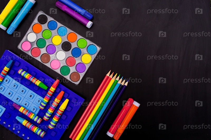 Черный фон с множеством разноцветных карандашей. Школьные принадлежности разложены на черном фоне - вид сверху. Обратно в школу