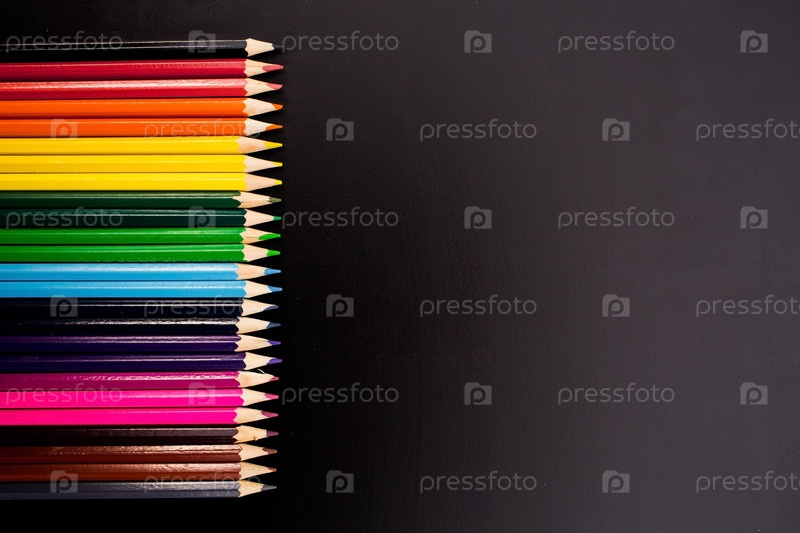 Черный фон с множеством разноцветных карандашей. Школьные принадлежности разложены на черном фоне - вид сверху. Обратно в школу