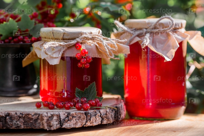 Домашнее полезное желе, варенье из красной смородины на фоне куста смородины. Подготовка банок. Сладости. Консервация и летний урожай