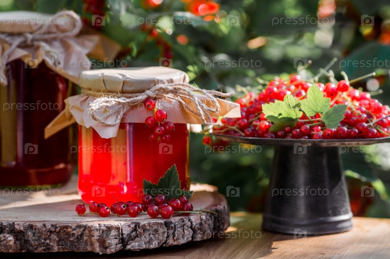 Домашнее полезное желе, варенье из красной смородины на фоне куста смородины. Подготовка банок. Сладости. Консервация и летний урожай